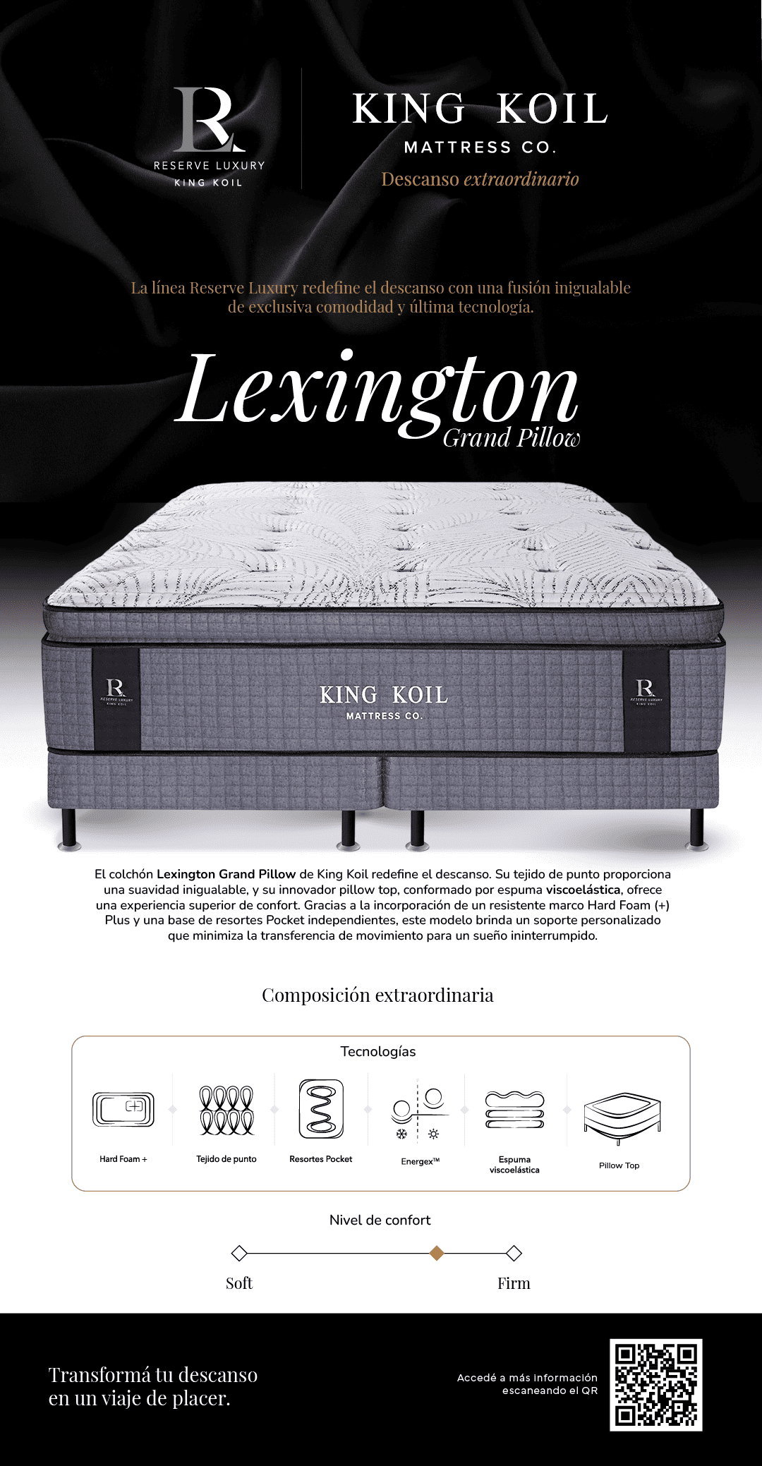 El colchón Lexington Grand Pillow de King Koil redefine el descanso. Su tejido de punto proporciona una suavidad inigualable, y su innovador pillow top, conformado por espuma viscoelástica, ofrece una experiencia superior de confort. Gracias a la incorporación de un resistente marco Hard Foam (+)